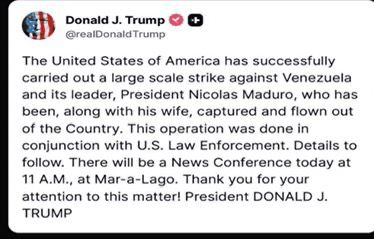 WASHINGTON/ CARACAS.– El presidente de los Estados Unidos, Donald Trump, declaró este sábado que su país ha realizado un ataque militar “a gran escala” contra Venezuela y que el presidente venezolano, Nicolás Maduro, junto con su esposa, ha sido capturado y trasladado fuera del país, según declaraciones presidenciales citadas por medios internacionales.