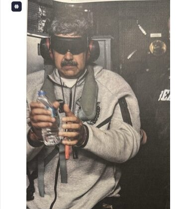 "Nicolás Maduro a bordo del USS Iwo Jima", firmó la fotografía. En la imagen se ve a Maduro con los ojos vendados y auriculares en la cabeza.