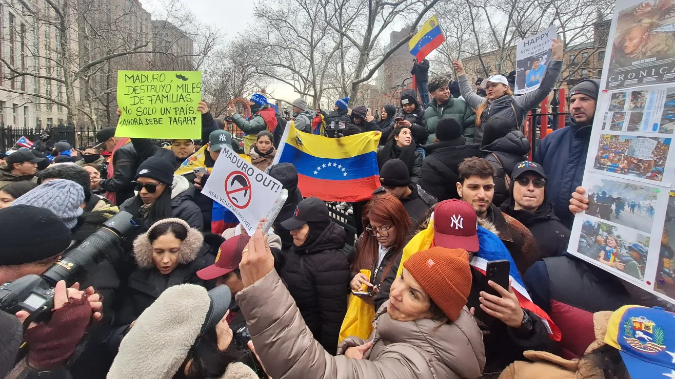 Allí, en los alrededores del Parque Columbus, al frente del edificio en donde el jefe del régimen venezolano acudió a su primera comparecencia, NYPD tuvo mucho trabajo para contener la euforia de miembros de la diáspora venezolana quienes proferían airados insultos, a un grupo de manifestantes convocados por la organización Forum People, bajo las consignas: ‘Saquen las manos de Venezuela’ y ‘Liberen a Maduro’.