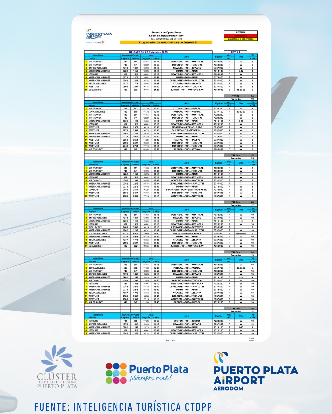 El Aeropuerto Internacional General Gregorio Luperón inició este enero 2026 con 78 rutas aéreas activas, conectando a Puerto Plata con 16 ciudades internacionales en Estados Unidos, Canadá, Europa y Centroamérica, a través de 11 aerolíneas.