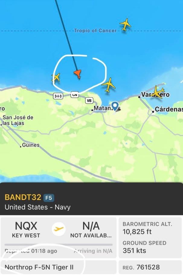 Este lunes, radares habrían identificado una aeronave militar F-5N Tiger II de Estados Unidos ingresando al espacio aéreo de Cuba, lo que generó atención y especulación. Según los registros, el avión habría despegado desde Key West, Miami, sin destino conocido.