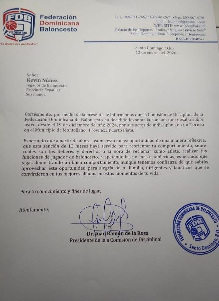 Puerto Plata, RD. — La Comisión de Disciplina de la Federación Dominicana de Baloncesto (Fedombal) decidió levantar la sanción que pesaba sobre el jugador Kevin Alexander Núñez, oriundo de la provincia Espaillat, la cual se mantenía vigente desde el 19 de diciembre de 2024.