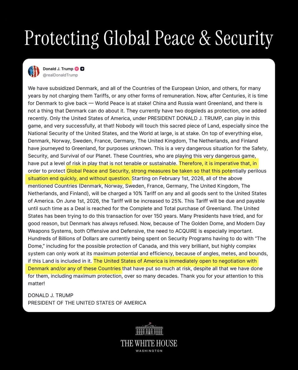 Trump también cuestionó la presencia de Dinamarca, Noruega, Suecia, Francia, Alemania, el Reino Unido, Países Bajos y Finlandia en Groenlandia, señalando que estos países han realizado visitas con “propósitos desconocidos”, lo que calificó como una situación peligrosa y no sostenible para la estabilidad global.