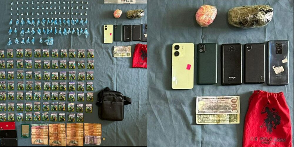 Las intervenciones se llevaron a cabo en el distrito municipal Carreras de Yeguas y en el sector Villa Esperanza, donde las autoridades ocuparon 92 porciones de un polvo blanco, presumiblemente cocaína, y 78 porciones de un vegetal verde, presuntamente marihuana.