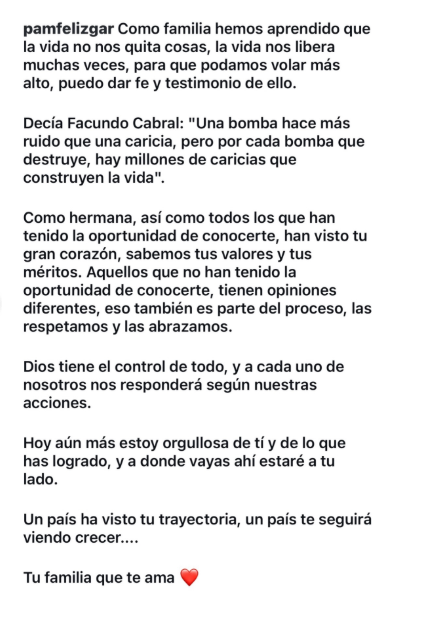 A través de un mensaje publicado en su cuenta de Instagram, Pamela Féliz afirmó que quienes han tenido la oportunidad de conocer a su hermano reconocen su calidad humana, principios y méritos, mientras que quienes no lo conocen pueden tener opiniones distintas, las cuales, según indicó, forman parte del proceso y merecen respeto.