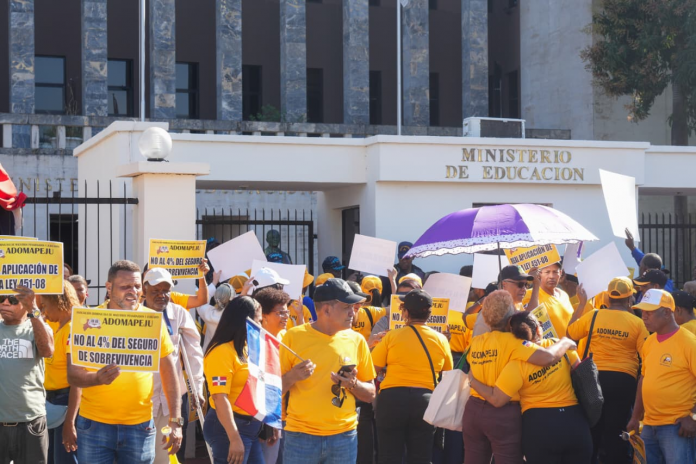 Santo Domingo.– La Asociación Dominicana de Maestros Pensionados y Jubilados (ADOMAPEJU), realizaron este jueves una protesta para exigir la correcta aplicación de la Ley 451-08, la cual establece la nivelación de sus pensiones al salario del maestro activo, así como el cese inmediato del descuento del 4 % correspondiente al seguro de sobrevivencia, el cual califican de ilegal.