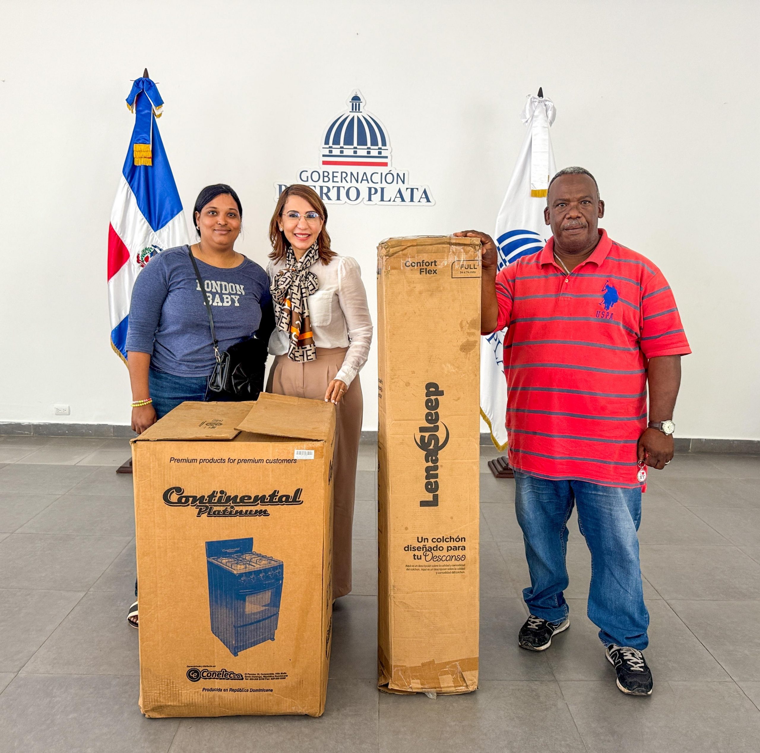 Puerto Plata.- La gobernadora provincial, Claritza Rochtte, realizó una entrega de ayudas a la señora Cristina Esmeralda de Aza Quiroz, quien recientemente perdió todos los ajuares de su vivienda a causa de un incendio ocurrido en la Urbanización General Gregorio Luperón, del municipio San Felipe de Puerto Plata.