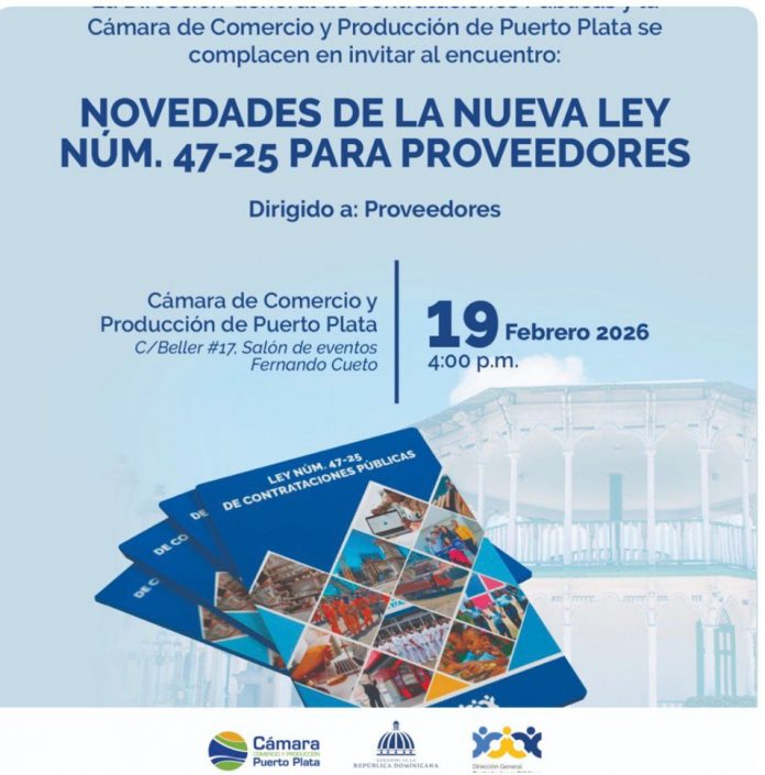 Puerto Plata, R.D. — La Cámara de Comercio y Producción de Puerto Plata, en coordinación con la Dirección General de Contrataciones Públicas, realizará una charla orientada a empresarios y emprendedores interesados en integrarse al sistema de compras gubernamentales bajo el nuevo marco legal vigente.