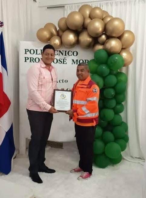 Sosúa, Puerto Plata, R.D. — El Politécnico Prof. José Morel entregó un reconocimiento a Rafael Arvelo, director de la Defensa Civil en Sosúa, en agradecimiento por la labor permanente que desarrolla esa institución en favor de la seguridad de los estudiantes del centro educativo.