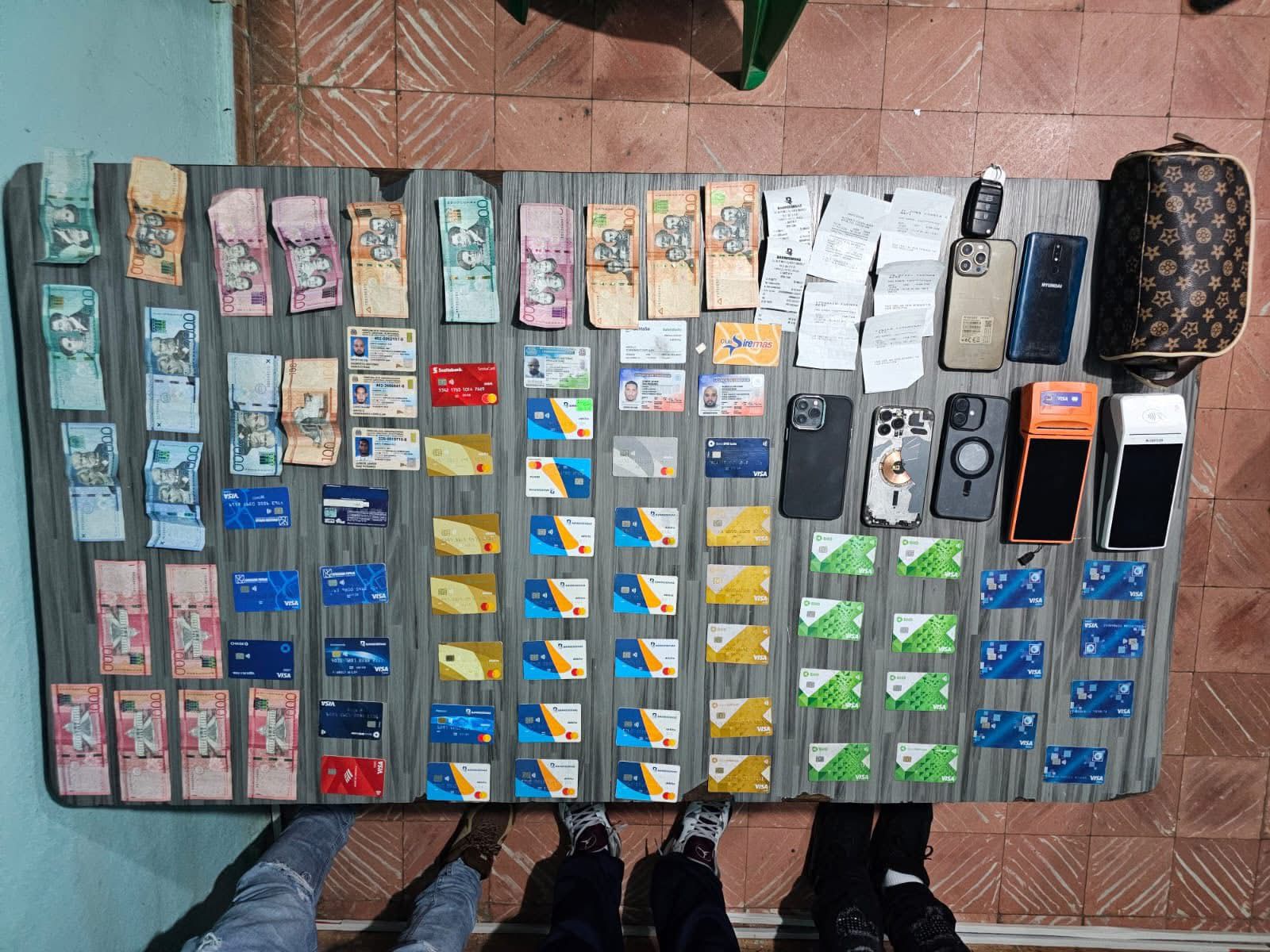 Durante el operativo, agentes policiales incautaron múltiples tarjetas, cuya procedencia y uso están siendo verificados como parte del proceso investigativo en curso.