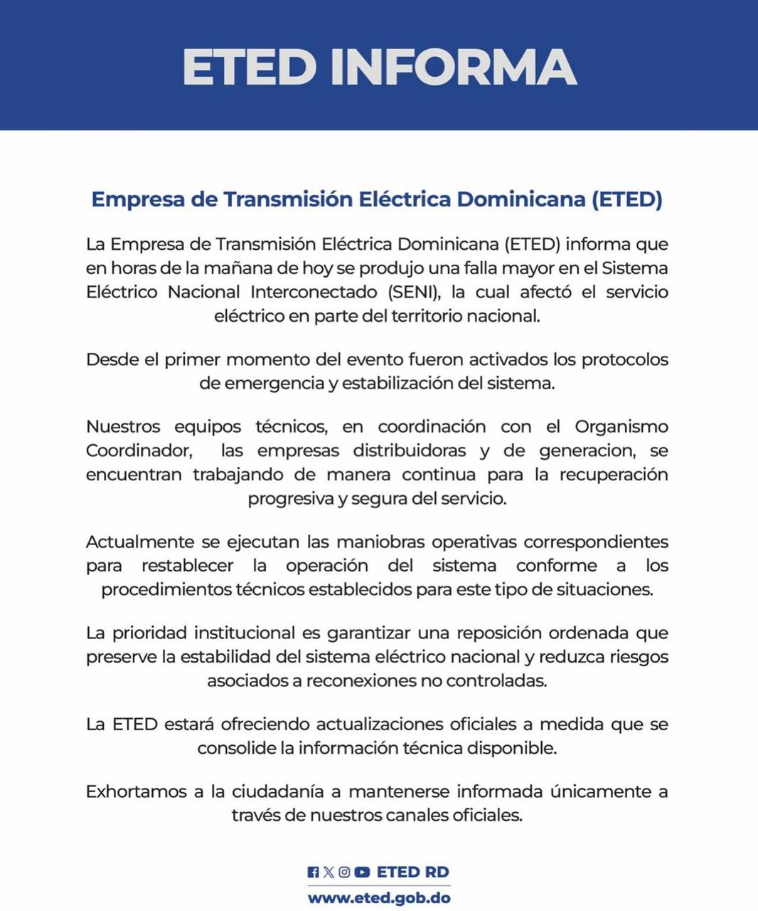 La ETED informó que desde el primer momento fueron activados los protocolos de emergencia y “nuestros equipos técnicos, en coordinación con el Organismo Coordinador, distribuidoras y empresas de generación, trabajan de manera continua en la recuperación progresiva y segura del sistema”.