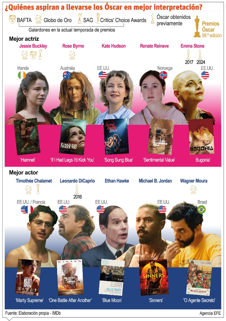La Academia de las Artes y las Ciencias Cinematográficas de Hollywood celebra este domingo por la noche la 98 edición de los premios Óscar en el Dolby Theatre, en una ceremonia rodeada de expectación en la que 'Sinners' y 'One battle after another' parten como favoritas. Presentada por Conan O’Brien por segundo año consecutivo, la gala se transmitirá en directo por ABC.
