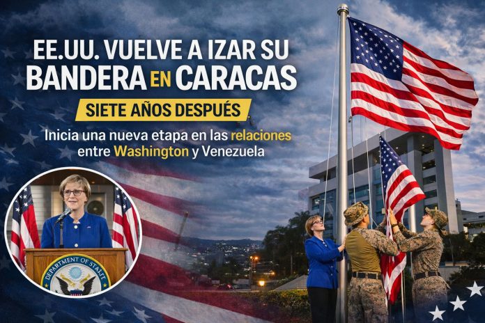 Caracas.- Por primera vez en siete años, el Gobierno de Estados Unidos izó este sábado la bandera de su país en la embajada estadounidense en Caracas, pocos días después de que Venezuela y EE.UU. restablecieran relaciones diplomáticas.