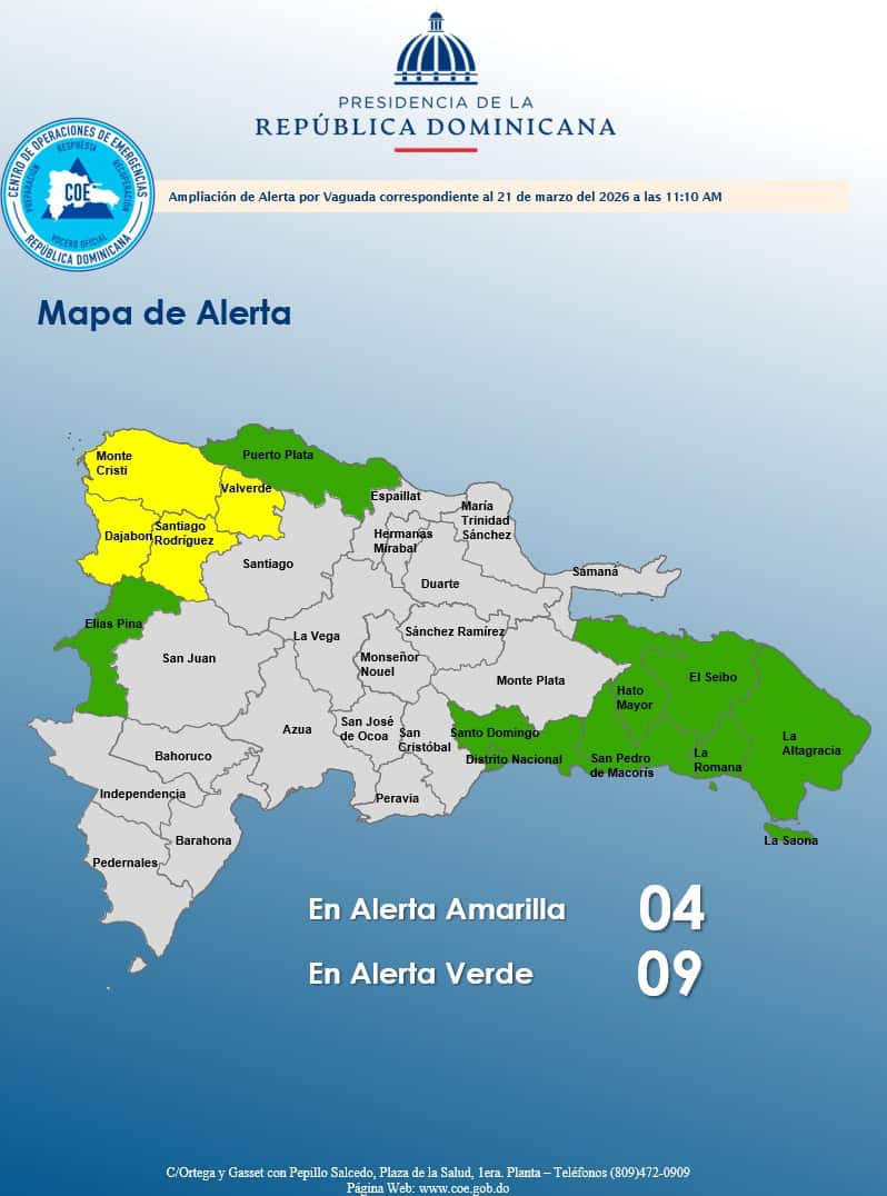 En tanto, permanecen en alerta verde Puerto Plata, San Pedro de Macorís, La Romana, Elías Piña, El Seibo, Hato Mayor, el Distrito Nacional, la provincia Santo Domingo y La Altagracia.