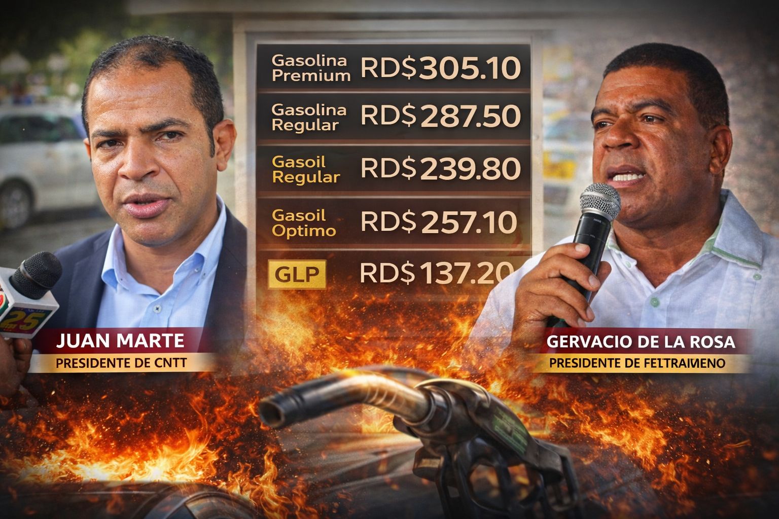Asimismo, apeló a un diálogo sincero y directo con el presidente Luis Abinader, al tiempo que reconoció que el encarecimiento de los carburantes está vinculado al conflicto en Medio Oriente y a la presión internacional sobre el mercado petrolero. El Gobierno, a través del Ministerio de Industria, Comercio y Mipymes, informó que para esta semana la gasolina premium subió a RD$305.10, la gasolina regular a RD$287.50, el gasoil regular a RD$239.80 y el gasoil óptimo a RD$257.10, mientras que el GLP se mantuvo en RD$137.20 por galón.
