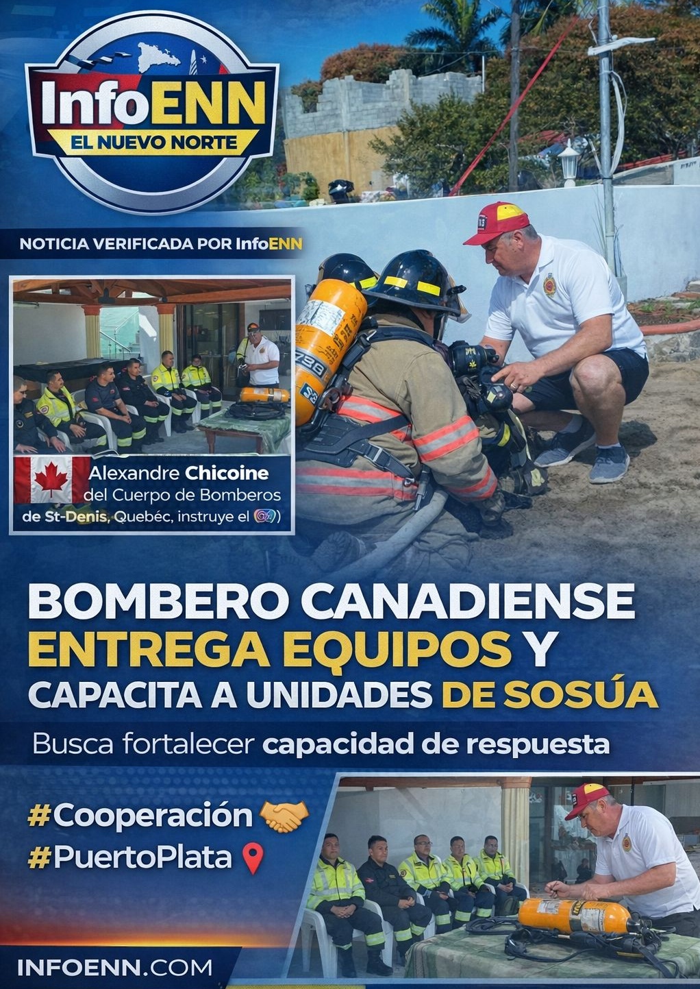 Sosúa, Puerto Plata.– El teniente Alexandre Chicoine (#113), miembro del Cuerpo de Bomberos de St-Denis, Quebec (Canadá), realizó una entrega de equipos y ofreció instrucciones técnicas al Cuerpo de Bomberos de Sosúa, en una jornada enfocada en fortalecer la capacidad de respuesta ante emergencias.