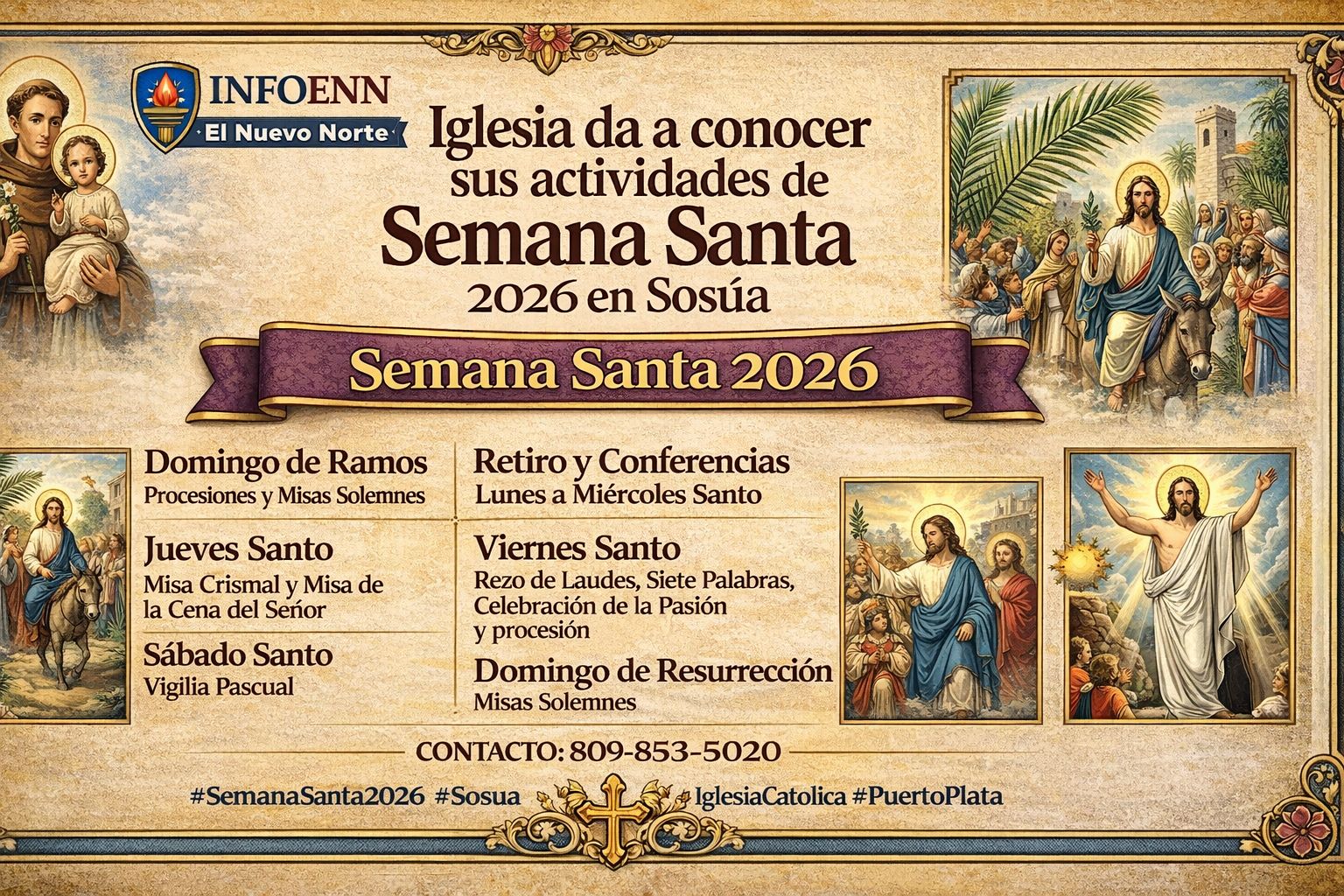 Sosúa, Puerto Plata.– La Parroquia San Antonio de Padua de Sosúa, perteneciente a la Diócesis de Puerto Plata, dio a conocer de manera oficial el programa de actividades religiosas que desarrollará durante la Semana Santa 2026, invitando a toda la feligresía a integrarse a este tiempo de reflexión, oración y recogimiento espiritual.