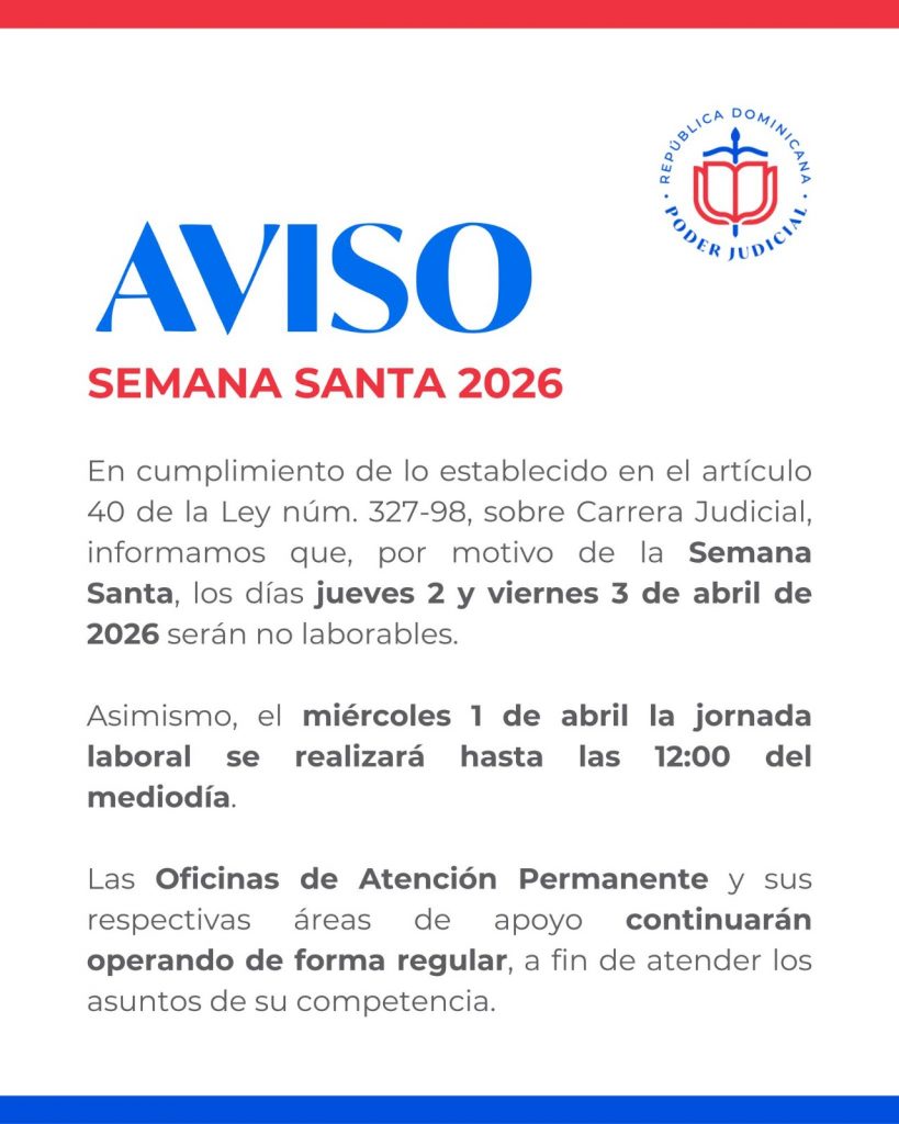 Así lo comunicó mediante un aviso el Poder Judicial de República Dominicana, donde indica que en cumplimiento a los establecido en el artículo 40 de la Ley No. 327-98 sobre Carrera Judicial, por motivo de la semana Santa, los días antes señalados no serán laborables.