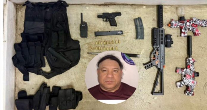 Durante la intervención, las autoridades ocuparon una pistola calibre 9mm con su cargador y varias cápsulas, además de un chaleco táctico de uso militar con porta pistola, un cinturón táctico, un bastón metálico retráctil, un fusil de hidrogel y dos pistolas plásticas de hidrogel.