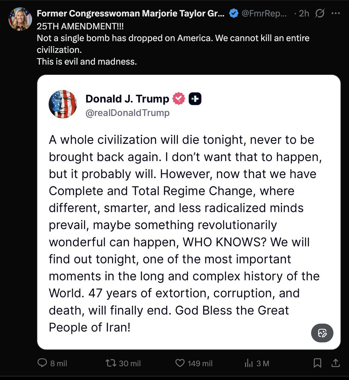 En una publicación reciente, Greene reaccionó a un mensaje de Trump en el que advirtió que “toda una civilización podría morir esta noche” en medio de la escalada del conflicto con Irán, además de plantear un posible “cambio total de régimen”. La exlegisladora calificó estas declaraciones como “maldad y locura”, marcando un giro radical frente a quien fue uno de sus principales aliados políticos.