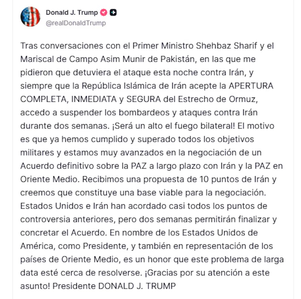 “Se han acordado casi todos los puntos de controversia anteriores entre Estados Unidos e Irán, pero un período de dos semanas permitirá que el acuerdo se finalice y se concrete”, dijo Trump en la publicación.