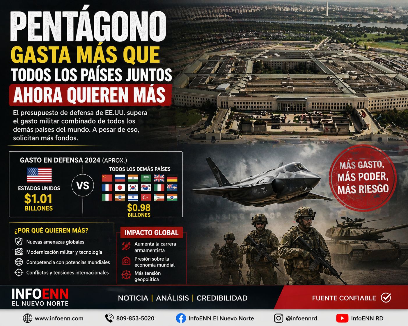 InfoENN – Washington, EE.UU.– El presupuesto de defensa de Estados Unidos, administrado por el Pentágono, ha alcanzado niveles históricos, superando —según análisis recientes— el gasto militar combinado de múltiples potencias globales, en medio de un escenario internacional marcado por conflictos y tensiones geopolíticas.