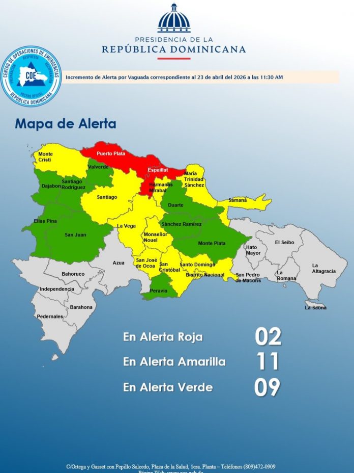 Las provincias en alerta roja son Puerto Plata y Espaillat, ante el riesgo de inundaciones urbanas y rurales, crecidas de ríos, arroyos y cañadas, así como deslizamientos de tierra.