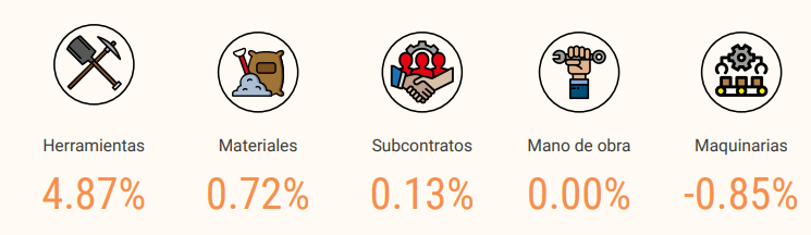 El incremento general del índice estuvo impulsado principalmente por el aumento en herramientas, que subieron 4.87 %, y materiales, con un 0.72 %. Asimismo, los subcontratos mostraron una leve variación de 0.13 %.