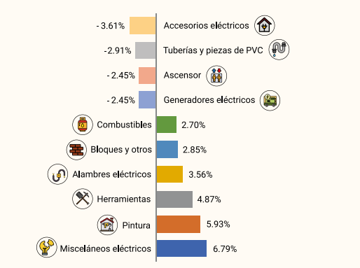 En contraste, las principales reducciones se observaron en accesorios eléctricos (-3.61 %), tuberías y piezas de PVC (-2.91 %), así como en generadores eléctricos y ascensores (-2.45 %).