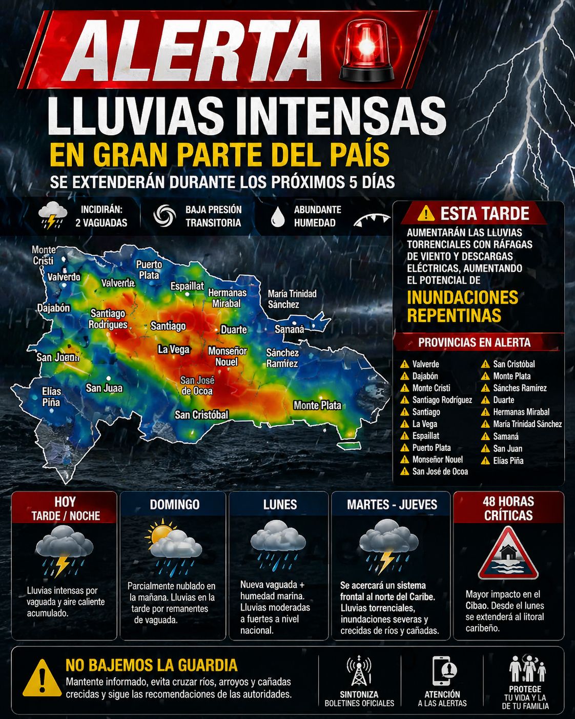El mayor impacto se concentrará inicialmente en la región del Cibao en las próximas 48 horas, pero a partir del lunes se extenderá hacia el litoral caribeño.
