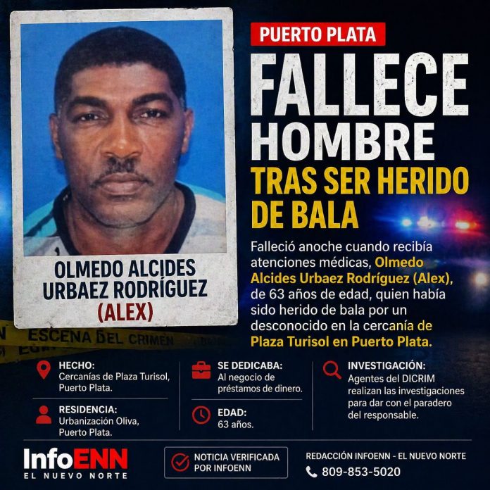 InfoENN – El Nuevo Norte Puerto Plata, RD. – Falleció la noche del sábado mientras recibía atenciones médicas el señor Olmedo Alcides Urbaez Rodríguez (Alex), de 63 años de edad, quien había resultado herido de bala por un desconocido en las cercanías de la plaza Turisol, en esta provincia.