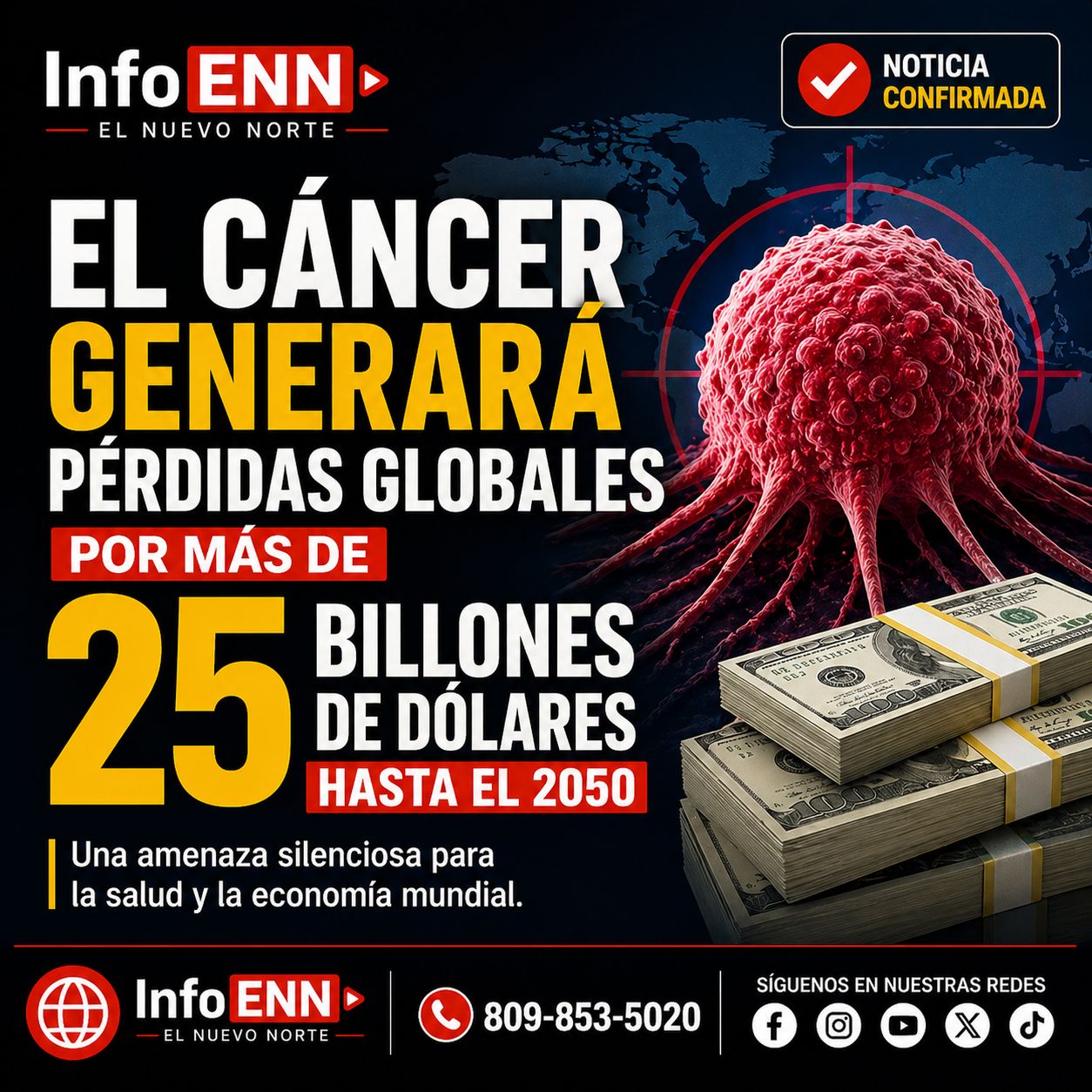 InfoENN – El Nuevo Norte Internacional.– El impacto del cáncer no solo representa una crisis de salud pública, sino también una amenaza económica de gran escala. Estudios recientes estiman que esta enfermedad provocará pérdidas globales que superan los 25.2 billones de dólares entre 2020 y 2050, una cifra que refleja su creciente carga sobre las economías del mundo.