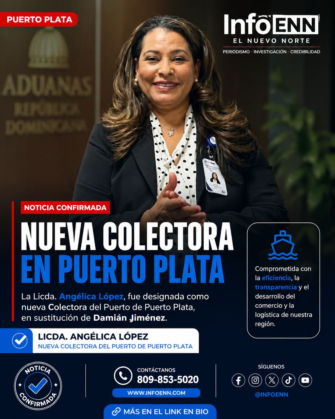 InfoENN – El Nuevo Norte Puerto Plata, R.D.– La licenciada Angélica López fue designada como nueva colectora del Puerto de Puerto Plata, en sustitución de Damián Jiménez.