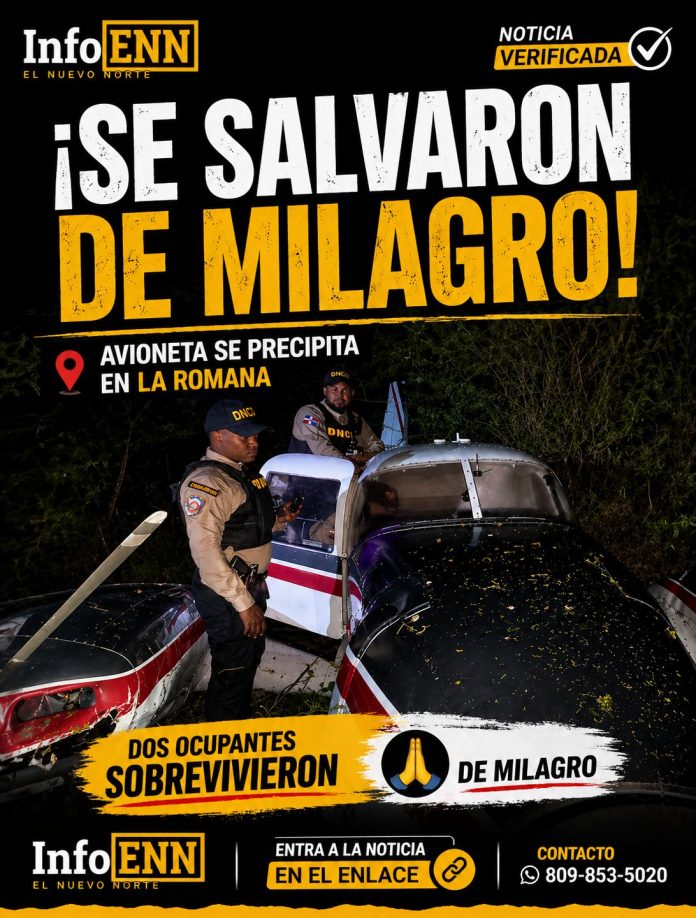 InfoENN – El Nuevo Norte La Romana, R.D. — Un empresario y un piloto lograron sobrevivir de manera casi milagrosa la noche del miércoles, luego de que una avioneta se precipitara a tierra pocos minutos después de despegar, en las proximidades de Cumayasa y el distrito municipal de Caleta.