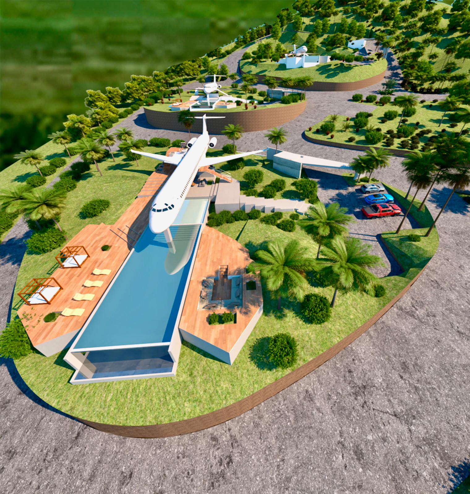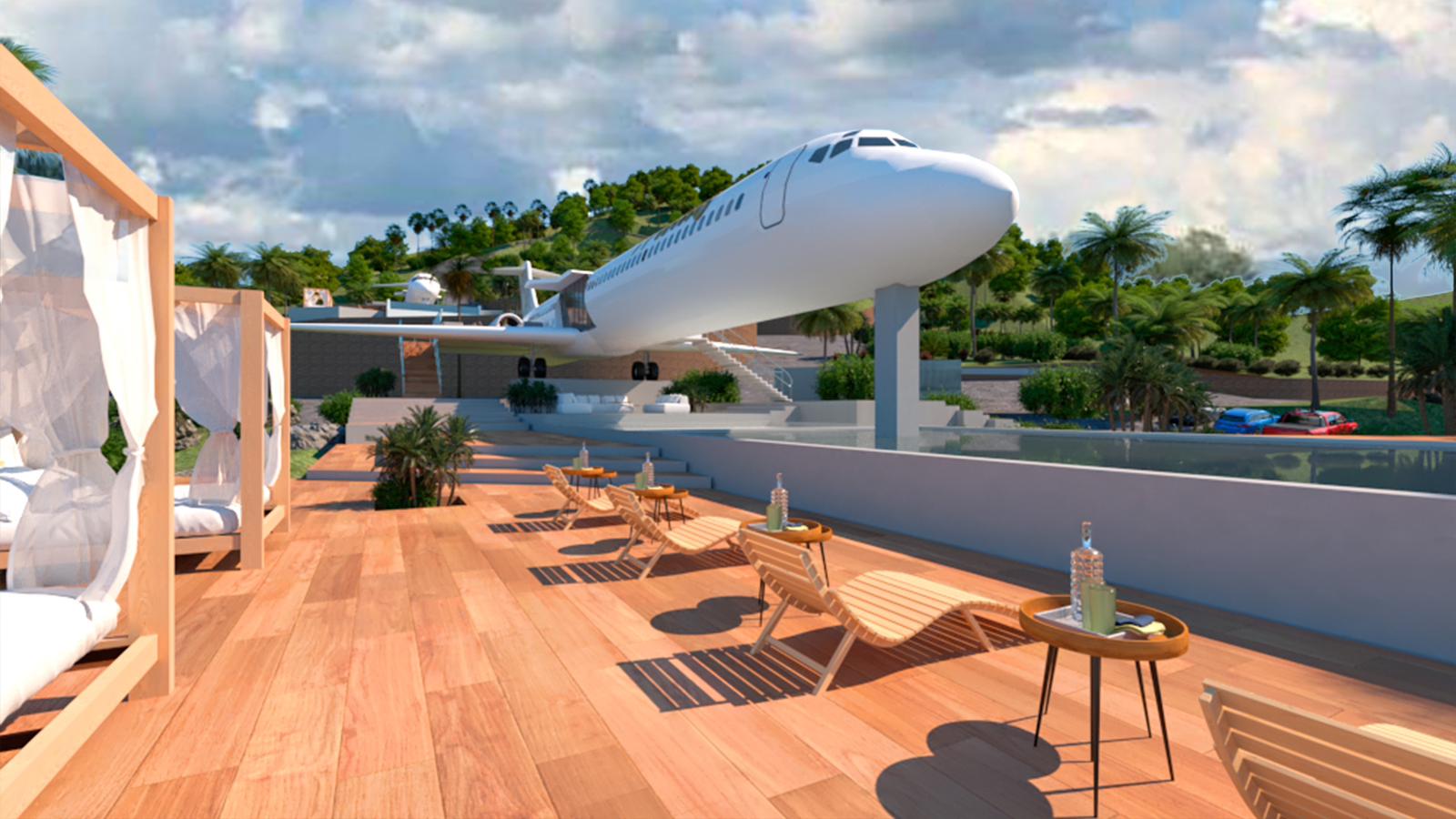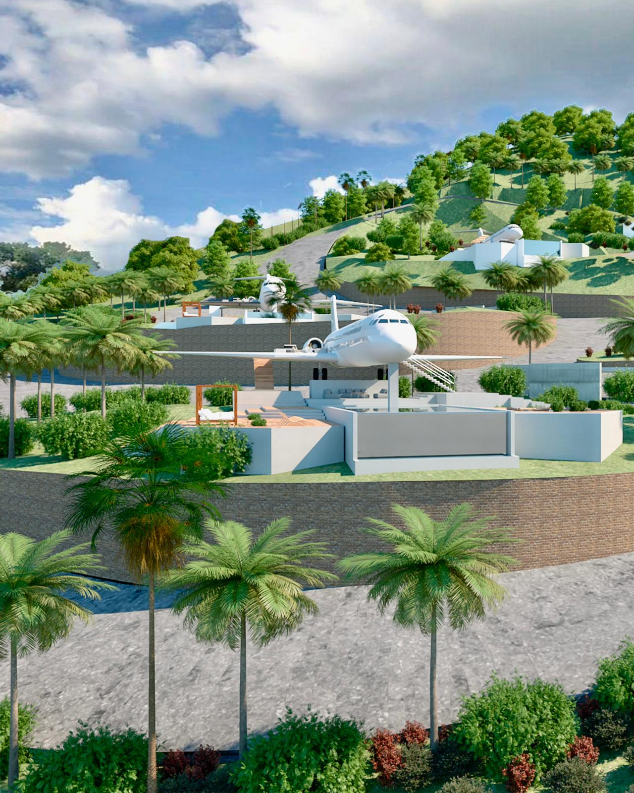 Se trata del aterrizaje de tres aviones en las montañas de la ciudad de Miches; cuyo diseño arquitectónico está a cargo del destacado Arquitecto Carlos Martínez, quien ha integrado los aviones a este entorno de montañas, playas y lagunas para brindar un estilo de hospedaje sin precedentes.